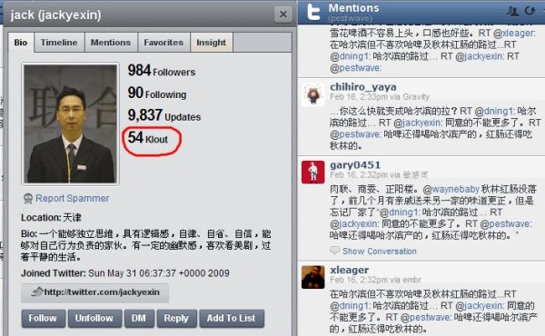 或许你在新浪微博上一呼百应一笑倾城,或许你在人人网上呼风唤雨撒豆成兵,或许你的QQ好友超过了牛魔王身上的牛虱孙悟空身上的猴毛,但你到底有多牛?你的气场到底有多大?如果以100分为满分,你的在网上的影响力有几分?有没有办法通过定量方法对你的影响力进行衡量?答案是有的。 今天看到社交网络影响力指标 Klout在其 官方博客上发布了一个 Chrome扩展,让你可以在Twitter上看到自己的影响力指数。如下图所示: