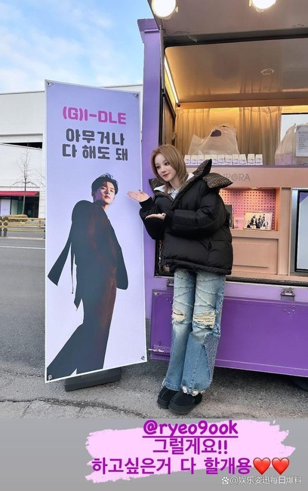 而在几个月后,i-dle 以第二张正规专辑《2》回归时,厉旭也回送了应援咖啡车,只见应援横幅上写着「Super Lady Super i-dle!Super Junior 厉旭请客 i-dle 不管做什么都可以」。雨琦开心在限时动态中上传多张认证照,写下「最棒的前辈!非常非常感谢」、「这真的是什么都有的应援咖啡车」、「我会的!我会去做所有想做的事」、「我是幸福的 E.L.F. 雨琦」等等。