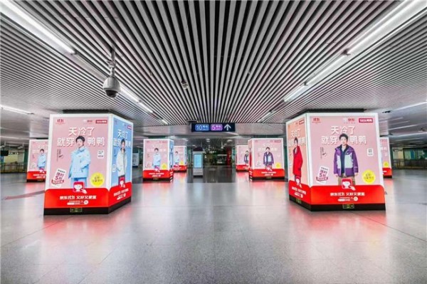 据悉,鸭鸭品牌线下传播矩阵已涵盖电梯、高铁、地铁、机场、商圈大屏等诸多人群流动的核心枢纽点,形成“百城万屏”的线下传播网络。从“百年金街”春熙路街头的巨幅裸眼3D大屏、杭州西湖天幕大屏,到北京西直门、上海人民广场、南京新街口、杭州龙翔桥等城市中心核心商圈的地铁站;从上海虹桥机场、北京首都国际机场、哈尔滨太平国际机场、成都双流以及天府机场等航空港到遍布全国高铁站的广大屏幕;再加上全国范围内百余座城市的电梯媒体......无数的媒介终端共同构成了鸭鸭羽绒服的品牌传播端触点,在线下空间形成了深入场景、高频饱和的品牌曝光网络。