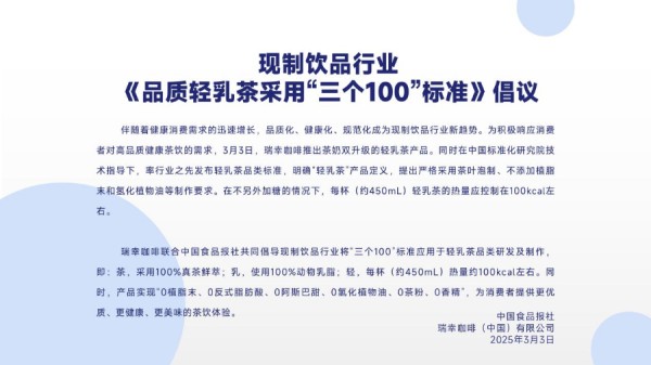 随着健康消费理念深入人心,新式茶饮行业正迈向品质化、规范化发展新阶段。2025年3月3日,瑞幸咖啡在中国标准化研究院技术指导下制订了轻乳茶品类标准,在此基础上,瑞幸咖啡联合中国食品报社发布《品质轻乳茶 采用“三个100”标准》倡议,提出“三个100”轻乳茶标准——“茶:100%真茶鲜萃,乳:100%动物乳脂,轻:每杯(约450mL)热量100kcal左右”,为轻乳茶品类划定清晰边界。