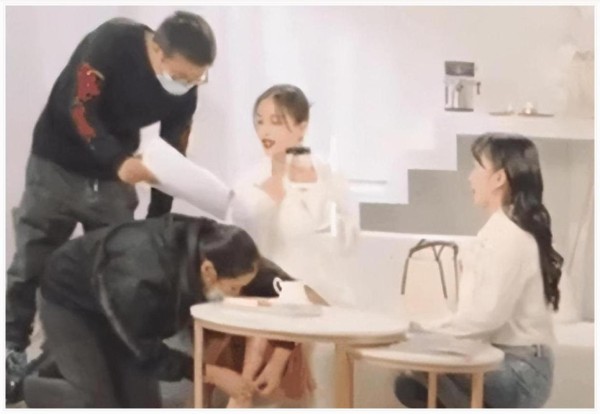 助理双膝跪地、埋头为女星扣高跟鞋扣 而当事人坐在沙发上淡定聊天、手里捧着饮料——你敢信这不是宫斗剧,而是2021年真实娱乐圈片场?