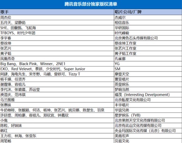 而当前,据媒体最新统计分析,在日本、韩国、台湾、香港等多个地区的唱片公司合作中,腾讯音乐版权独家占有率约90%,分别与英皇、东亚、TVB、杰威尔、华研、相信音乐、福茂、飞碟,SM、YG、JYP、CJ等公司签署独家合作协议,并对部分厂牌进行了投资。目前,周杰伦、五月天、SHE、张艺兴、TFBOYS、蔡徐坤、凤凰传奇等头部艺人的版权都在腾讯音乐手中。