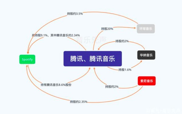 以和三大唱片的持股关系为例,腾讯和腾讯音乐斥资约70亿美元先后购入了环球音乐共计20%的股份。腾讯音乐持股华纳音乐1.6%,华纳音乐持股、索尼音乐娱乐分别持股腾讯音乐2%。