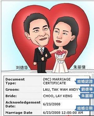 最后不得不说的是天王天嫂相濡以沫,隐忍24年的爱情传说。刘德华在媒体与网友们的疯狂推测和猜想过后,终于大方承认结婚,尽管滞后注册时间一年多,尽管我们只能看到Q版的婚纱照,但是我们都给予了与曾经不同的理解和祝福。