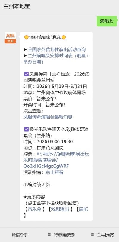 温馨提示:微信搜索并关注公众号【兰州本地宝】,发送【演唱会】,即可获取2026兰州演唱会最新演出安排、开票时间+入口、二开三开通知、演出场馆座位图、公交地铁自驾交通指南等。