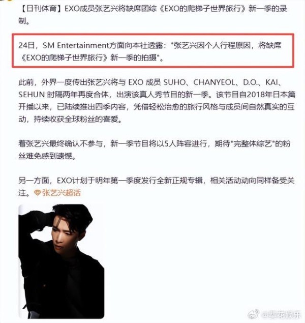 张艺兴缺席EXO新团综!往返中韩13次落空,SM的锅太气人