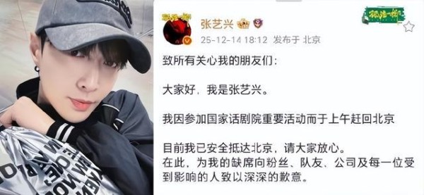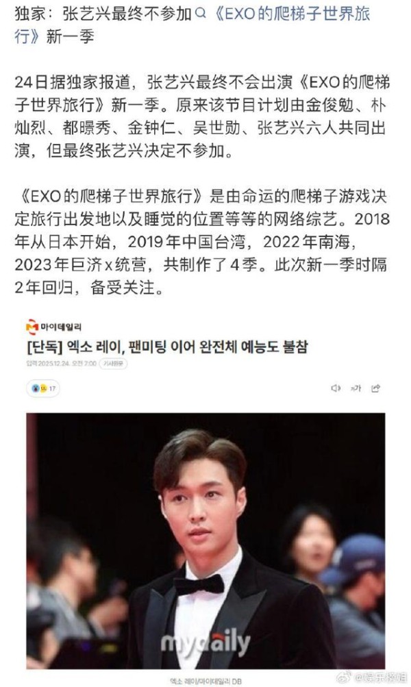 先把这波“团体活动缺席风波”理清楚。2025年12月24日,韩媒《My Daily》直接报道,张艺兴确定不参与EXO新团综录制,原本计划的金俊勉、朴灿烈等六人合体彻底泡汤。而就在10天前的12月14日,EXO粉丝见面会已经临时取消了他的出席,当时SM娱乐只甩了句“不可抗力”的模糊说法,后来还是张艺兴自己出来解释,是因为国家话剧院有紧急任务,不得不紧急返京。