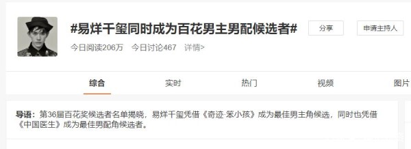 而易烊千玺的成就可不止这些,在此前的第36届大众电影百花奖公布的名单中,易烊千玺就以《奇迹·笨小孩》中景浩一角色进入最佳男主角候选者的名单,而与此同时他还凭借《中国医生》中的杨小羊一角成为最佳男配角。
