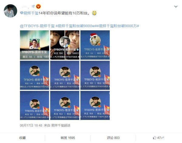 而粉丝们看到也是非常的感慨,有些更是一步步看着他从百万粉丝一直到近亿的粉丝。更有粉丝回忆起在2014年的年初,那个时候易烊千玺还只是希望自己的粉丝量能够破十亿,而现在仅仅半年的时间就已经涨到了9000万,真的是太让人感动了。
