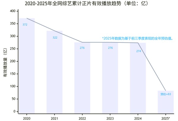 云合数据显示,今年截至第三季度,全网综艺TOP20的有效播放总量仅62亿。