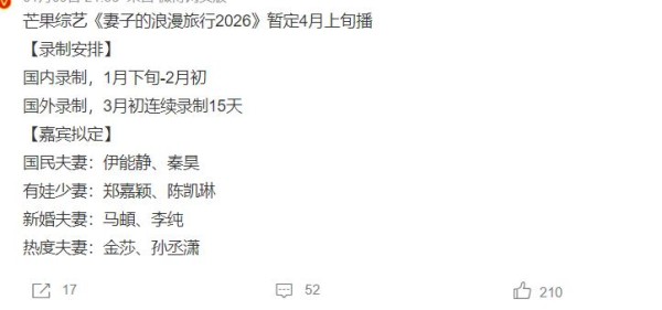 从传出的消息上看,《妻子的浪漫旅行2026》即将开始录制,将在4月份播出,网传的四对录制嘉宾,完全是自带热度和关注,所以大家非常满意,期待节目开播。