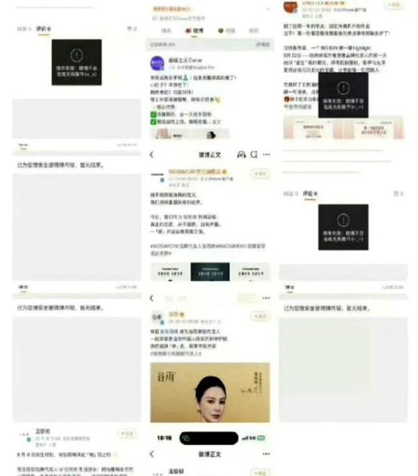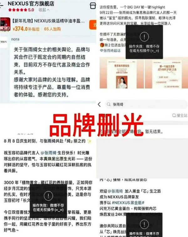 你点开那些曾经把她奉为“独立女性”典范的护肤、美妆品牌官博,比如NEXXUS、奢思雅、玉容初、谷雨,想重温一下姐姐的美貌,结果搜索她的名字,得到的回应是冷冰冰的“操作失败”或“无权查看”。
