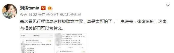 因为自己的行程被肆意泄露之后,刘涛在微博上面向网友大倒苦水,声称自己的一点隐私都没有,这样被偷拍,相关部门可以管管么?