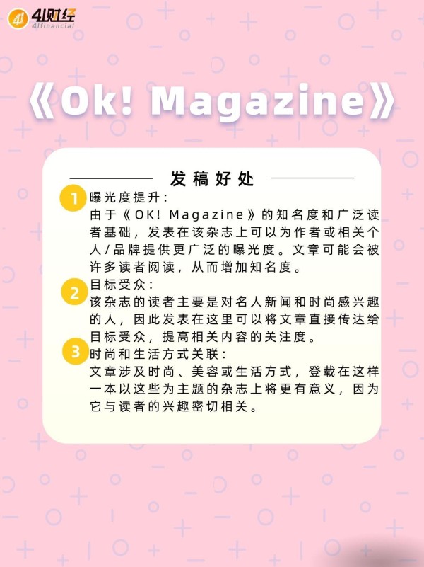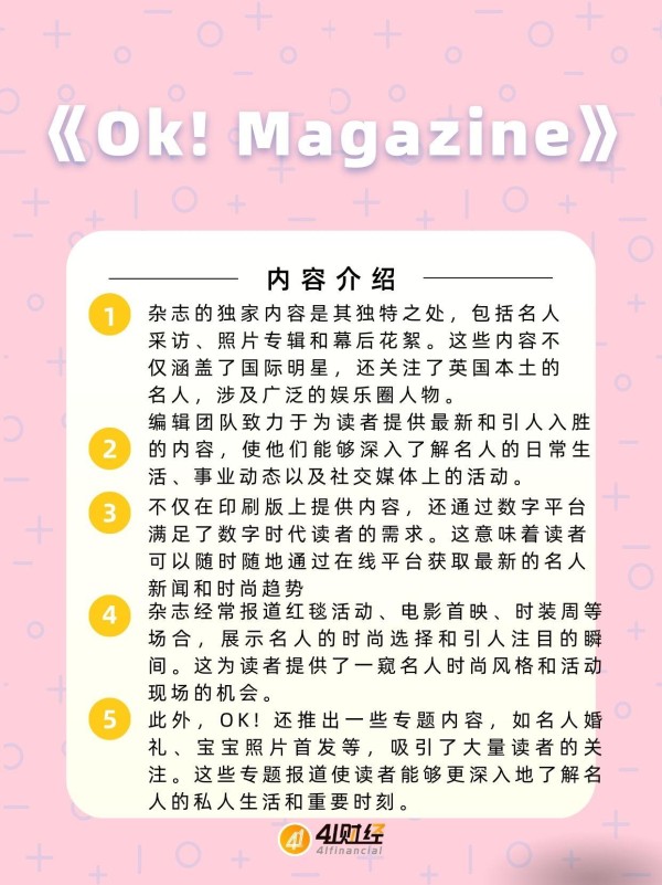 《Ok! Magazine》是一家主要专注于皇室和名人新闻的英国周刊,成立于1993年。该杂志以其深入报道、独❤️家采访和时尚生活信息而闻名,成为许多人关注名人新闻和时尚趋势的首选,被誉为全球最大的名人生活方式杂志,拥有超过3000万的全球读者,并在20个国家发行。