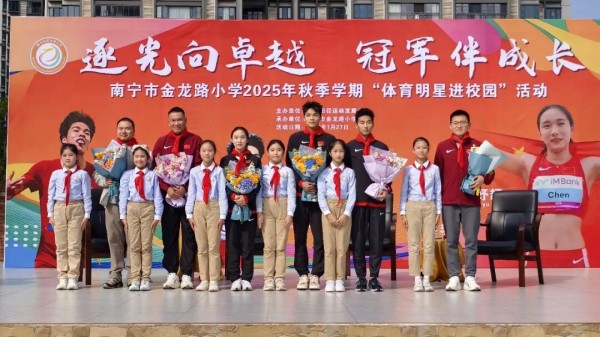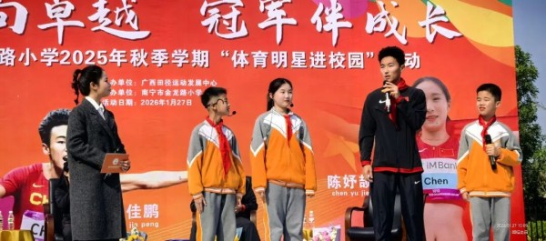1月27日下午,南宁市五象教育集团金龙路小学的操场上,洋溢着蓬勃朝气与欢声笑语。广西田径运动发展中心携手正在广西南宁市备战的国家田径队短跨组,共同带来一场别开生面的“体育明星进校园”活动。中国田径协会短跨队副领队尹贻杰、广西田径队总教练兼国家队教练陈文忠及国家队运动员曾克理、陈妤颉、陈佳鹏走进校园,与孩子们展开一场充满活力的零距离交流。
