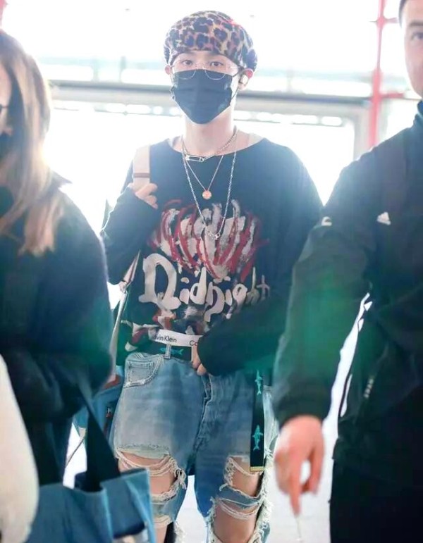 黄明昊的这一身穿搭可谓时尚前卫,巧妙地将涂鸦、豹纹与破洞等多元时尚元素融合在一起,展现出随性洒脱又不失条理的风采,充分体现了Justin本人独特的风格魅力。他头戴的豹纹印花贝雷帽与金丝边框眼镜相映成趣,既彰显了个性又不失可爱气质。