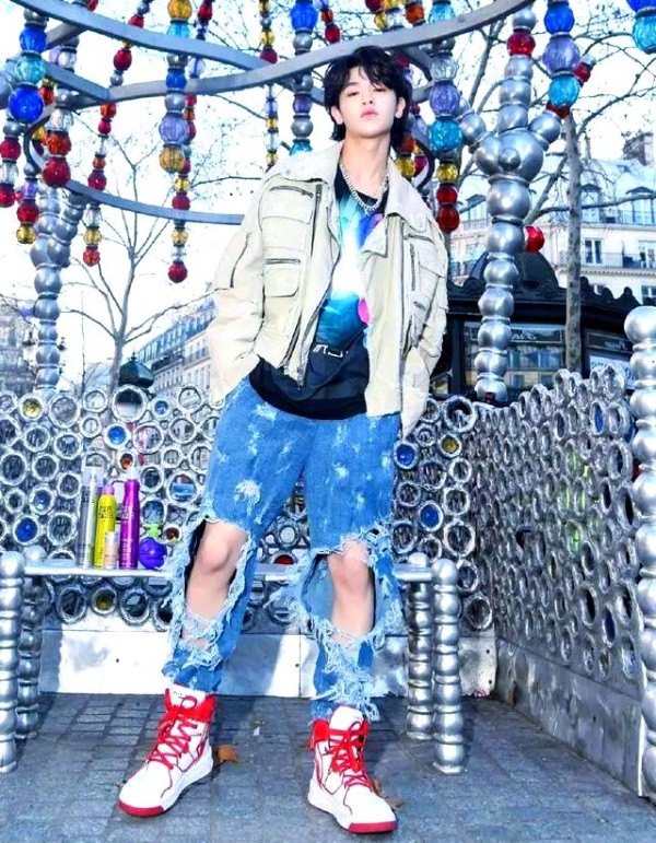 将上衣巧妙地塞入牛仔裤中,再配以一条黑色干部腰带,不仅提升了腰线,更在视觉上拉长了身材比例。身高182公分的小贾,如此穿搭,果真穿出了他应有的挺拔身姿。而裤子上的别致破洞设计,更是大胆而醒目,几乎要破成丝儿了,这种独特的个性,实在令人瞩目。