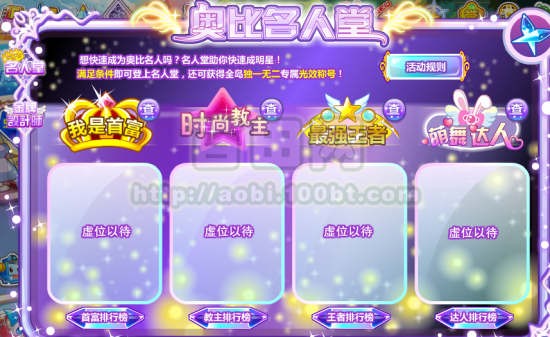 奥比岛奥比名人堂快速成明星 名人堂助你快速成明星!满足条件即可登上名人堂,还可获得全岛独一无二专属光效称号! 活动奖励:我是首富标签、时尚教主标签、最强王者标