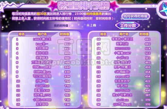 每日时尚值最高的前30名用户将进入排行榜,关服前时尚值最高的奥比将成为明日时尚堂主!(时尚值相同时,按时间排序)