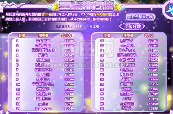 每日圣精灵战斗力最高的前30名用户将进入排行榜,关服前的第一名最高的奥比将成为明日最强王者堂主!(战斗力相同时,按时间排序)