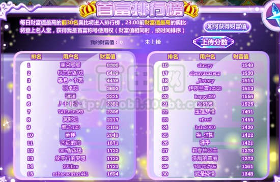 每日财富值最高的前30名用户将进入排行榜,关服前财富值最高的奥比将成为明日首富堂主!(财富值相同时,按时间排序)