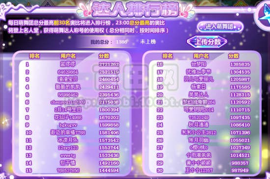 每日萌舞团总分最高的前30名用户将进入排行榜,关服前的第一名最高的奥比将成为明日萌舞达人堂主!(总分相同时,按时间排序)