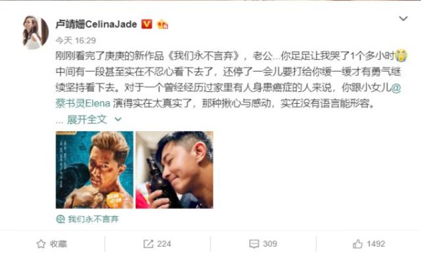 二人的感情无论婚前还是婚后都很甜蜜,近日妻子卢靖姗还为韩庚的新电影吆喝宣传了。4月16日,卢靖姗在个人社交平台发长文为韩庚宣传新电影《我们永不言弃》,她表示自己看的时候足足哭了一个多小时,期间还一度因情绪太过悲痛而暂缓观看,赞扬韩庚和剧中小演员演得太真实,令她十分揪心以及感动。