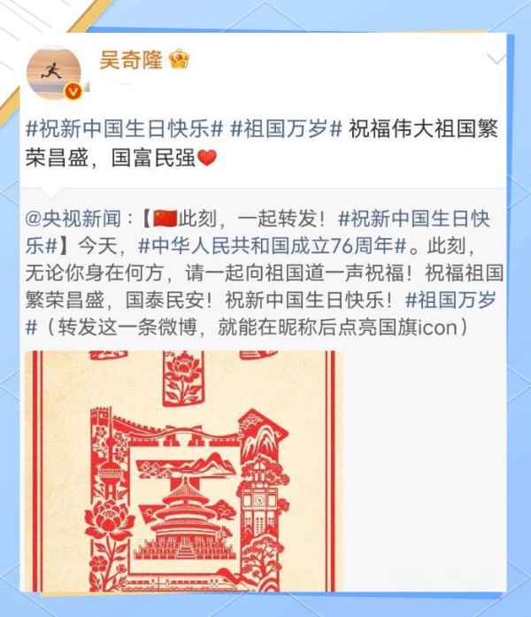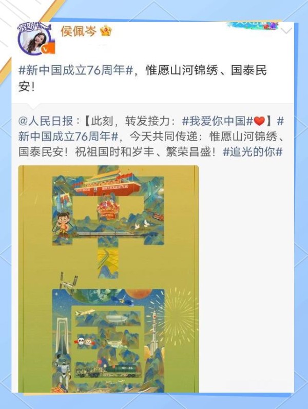 在祖国76周年华诞的喜庆时刻,众多明星齐声献上祝福。侯佩岑同样不落人后,积极转发并深情表达自己的祝福,这一举动赢得了网友们的广泛赞誉。这不仅体现了艺人应有的社会责任,更为整个行业树立了一个值得学习的榜样。
