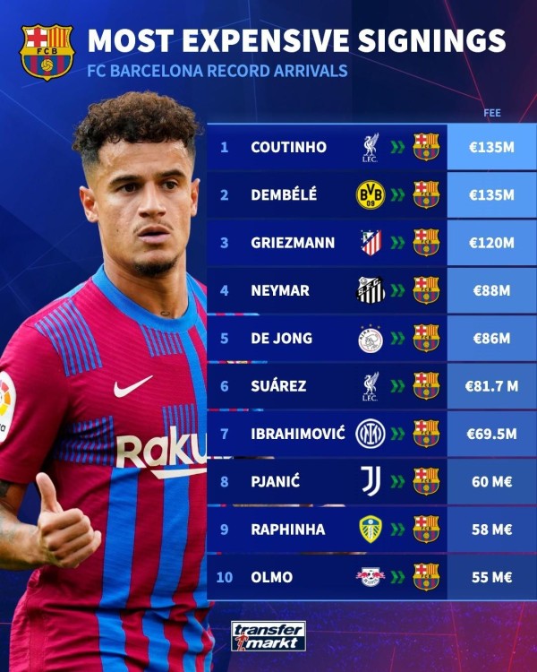 德转市场发布巴萨历史上最贵10笔引援,库蒂尼奥和登贝莱以1.35亿欧元位居首位,格列兹曼1.2亿欧元第三。