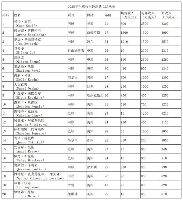 根据《福布斯》2025年全球女运动员收入榜,谷爱凌以2310万美元的年收入排在第四位,成为前五名中唯一的非网球运动员。更值得关注的是收入结构:其赛事奖金仅约10万美元,占总收入的比例不足0.5%,而商业代言收入高达2300万美元,占比99.5%。