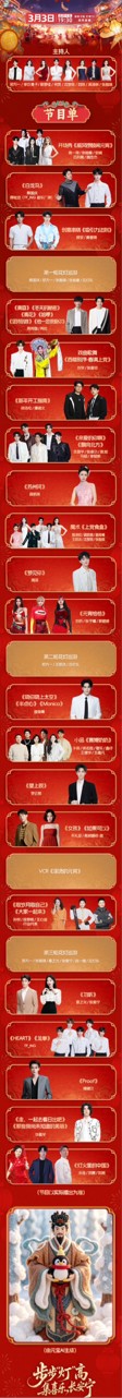 华晨宇将连唱两首歌曲,《走,一起去看日出吧》《那些我尚未知道的美丽》触动人心,薛凯琪《苏州河》的吴侬软语,刘忻、张予曦、郭碧婷带来的《元宵恰恰》的欢快轻盈;声鸣远扬危晋宇、张卓尔、高旭、马韬、李斌彬《亲爱的你呀》《飘向远方》温情献唱,夏之光、张紫宁《勿听》情意悠长,还有韦礼安与希林娜依·高《女孩》《如果可以》的热歌律动,曾舜晞《吻你吻上太空》《半点心》《Monica》炸翻全场。最后,刘赛、余笛、刘潮将带来的《灯火里的中国》点亮万家灯火。