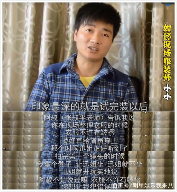 服装师就爆料说,美术指导张叔平要求说服装不能有褶皱,周迅在一旁听到了。等到拍完第一个镜头后,工作人员拿凳子让周迅坐的时候,他就开玩笑说:不是说过嘛,衣服不能有褶皱,你想让我犯错误吗?