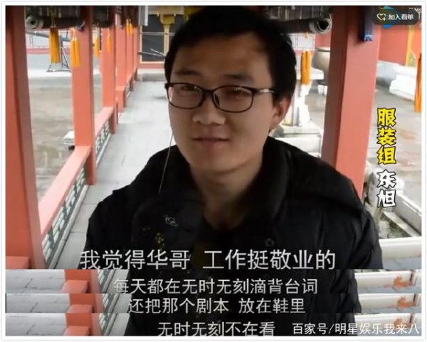 工作人员亲切地叫霍建华为“华哥”,他说,华哥很敬业,无时无刻不在背台词,还把剧本放在鞋里,无时无刻不再看。