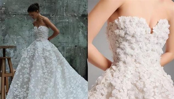 婚纱上点缀着3D薄纱与欧根纱花朵,层层堆叠出立体又丰盈的细节。 当她移动时,花朵仿佛会呼吸般绽放,完美勾勒出身形线条。