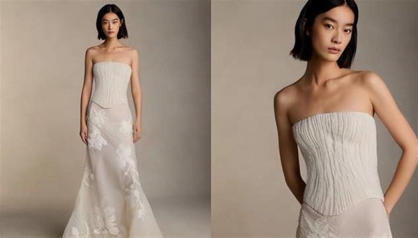 在雪地婚纱照中,申敏儿还换了另一套来自纽约品牌Danielle Frankel的两件式造型,以极简线条打造的平口马甲搭配透明感长裙,展现了现代与浪漫的完美结合。
