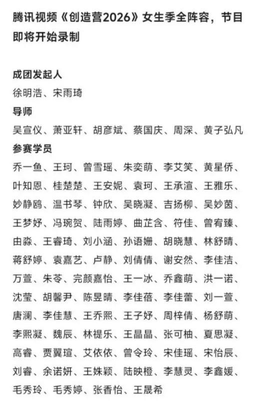 2025年初《声鸣远扬2025》等节目试水成功后,网传《创造营2026》女生季即将启动录制。这份名单迅速点燃社交媒体,吴宣仪、周深等六位导师的配置堪称"王炸"。