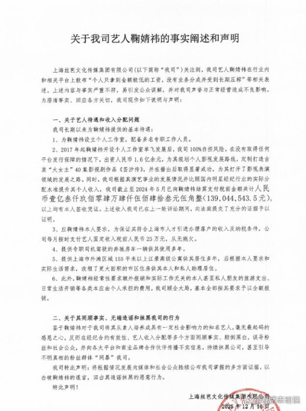 丝芭传媒在声明里那叫一个"慷慨陈词"。从2017年起,为了帮鞠婧祎满足上海落户的纳税条件,每月雷打不动地支付税前25万元固定工资,还拍着胸脯保证从未拖欠。不仅如此,截至2024年5月,累计支付税前1.39亿元结算款,这还只是"开胃菜"。上海外滩155㎡的江景公寓,后来还升级成更大的市区住房;专职司机开着奔驰房车随时待命;个人及朋友的旅游、生活开销,不管是不是工作相关,全部全额报销。更夸张的是,还出资1.6亿为她定制《芸汐传》等影视项目,风险全扛。这待遇,简直让人羡慕到"眼红"。