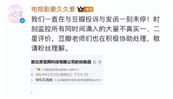 剧方在官方微博上表示,一直在监控豆瓣评分,并认为有大量不真实的一、二星评价。他们甚至发文称与豆瓣投诉与发函一刻未停,不认可给予一星、二星评价的观众。
