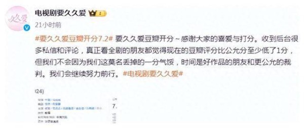 《要久久爱》这部电视剧由杨紫、范丞丞等人主演,开播以来评分在豆瓣上为7.2分。虽然这个分数在现今电视剧中算是不错的,但剧方似乎对此并不满意,认为真正看过全剧的观众都觉得这个分数低了至少1分。