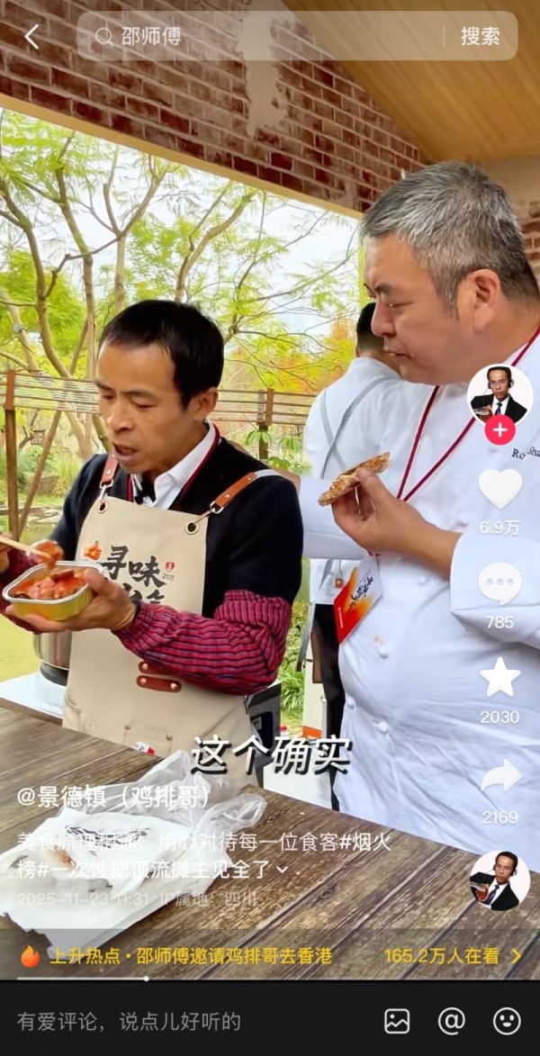 十一月下旬,爆红全网的@景德镇(鸡排哥)现身成都麓客岛,何洁、吴莫愁、马頔、王祖蓝、张远、杜海涛、洪剑涛等大批明星艺人前往排队试吃,@锅盖wer 等达人更是在摊位前边吃鸡排边整活,连《一饭封神》里的米其林大厨邵师傅也在场尝起了鸡排,还邀请鸡排哥去香港交流。
