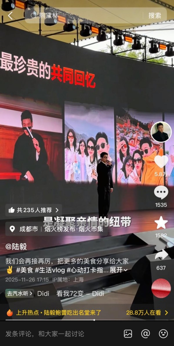 他的大多数探店视频,是与全家人一起,一边推荐美食,一边在热气腾腾的饭桌上拉拉家常。陆毅感慨到:“其实我分享的不仅仅是食物,也让自己与家人之间的情感更紧密了。”