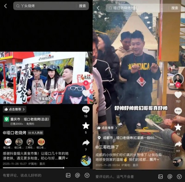 有些会整活儿的商家,现场营业的过程中就产出了多条热气腾腾的短视频。重庆垭口老烧烤的摊位前,老板在烧烤介绍、上点段子、秀点才艺中无缝切换,为了缓解消费者排队的不耐烦,老板会不断地介绍自己的豆干为什么好吃,介绍自家品牌的背景,还会一脸期待地蹲现场消费者的反馈。这些自发的现场交流,也被记录下来,成为线上传播最好的素材,将现场的烟火气传递到线上。