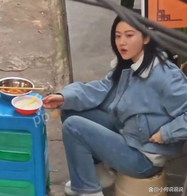 景甜片场吃豆浆油条被偶遇,素颜牛仔装气质出众,胖了后反而更美!景甜重庆街拍,牛仔装亮相