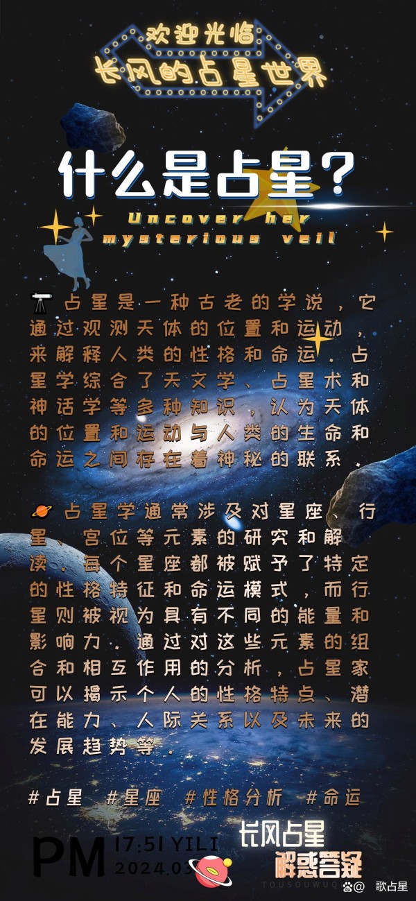 占星是一种古老的学说,它通过观测天体的位置和运动,来解释人类的性格和命运。占星学综合了天文学、占星术和神话学等多种知识,认为天体的位置和运动与人类的生命和命运之间存在着神秘的联系。