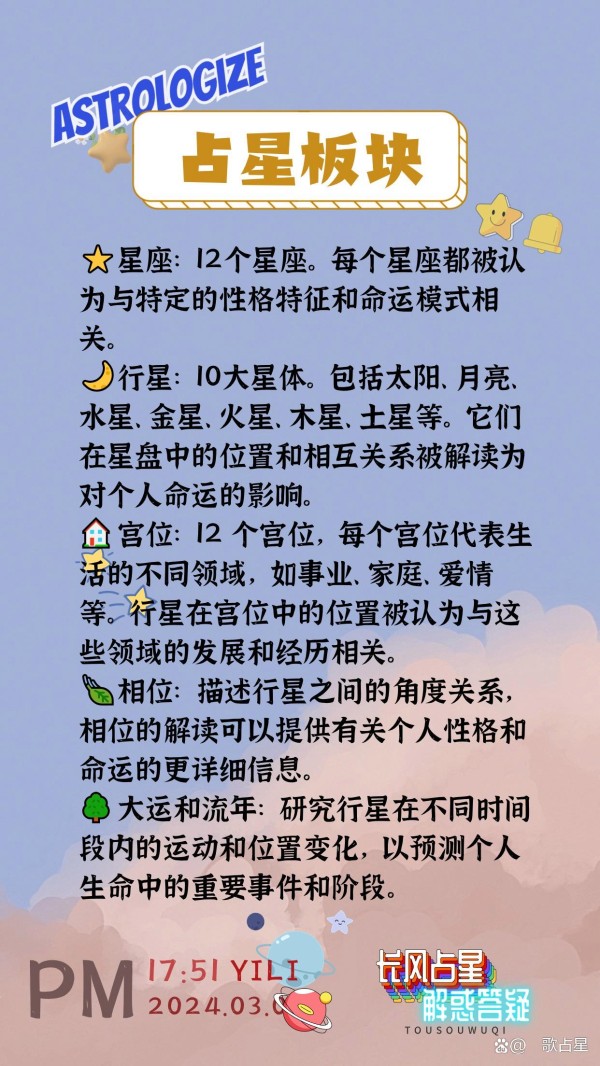 占星学通常包括以下几个主要板块: