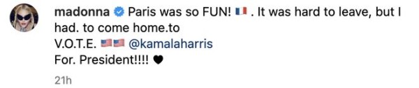早在2020年的时候,当时的麦当娜就曾对乔·拜登和卡玛拉·哈里斯展现出了支持的态度。她在Instagram上写道:“三张刚投完票的女孩的照片!大家快去履行责任吧!”