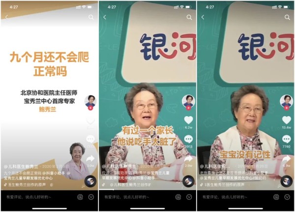 作为一名全国知名的儿科专家,鲍秀兰目前发布了452条短视频,如“应该让宝宝吃手吗”、“老抱着孩子是不是容易惯坏”、“九个月还不会爬正常吗”、“发热时可以使用退热贴么”等等,都是围绕幼儿父母最为关心的那些话题。