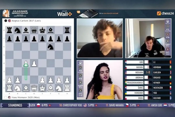 卡尔森(右上)在这场与尼曼的线上对弈中,仅仅第二回合就断网退赛