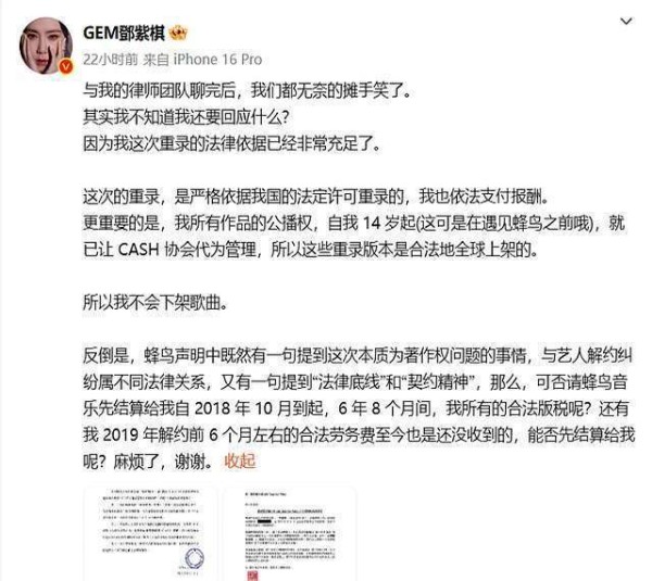 她也不是吃素的,立马回应,说自己是按照《著作权法》的规定重新录的,还反过来质问蜂鸟,六年拖欠的版税,还有解约前的工资,是不是该算算了?