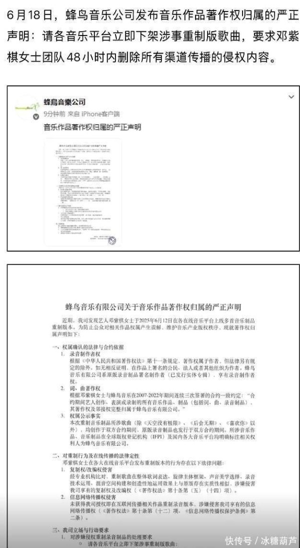 蜂鸟音乐跳出来发声明,说邓紫棋侵权了,还要求各大音乐平台下架重录的版本,让邓紫棋团队48小时内删掉“侵权作品”。